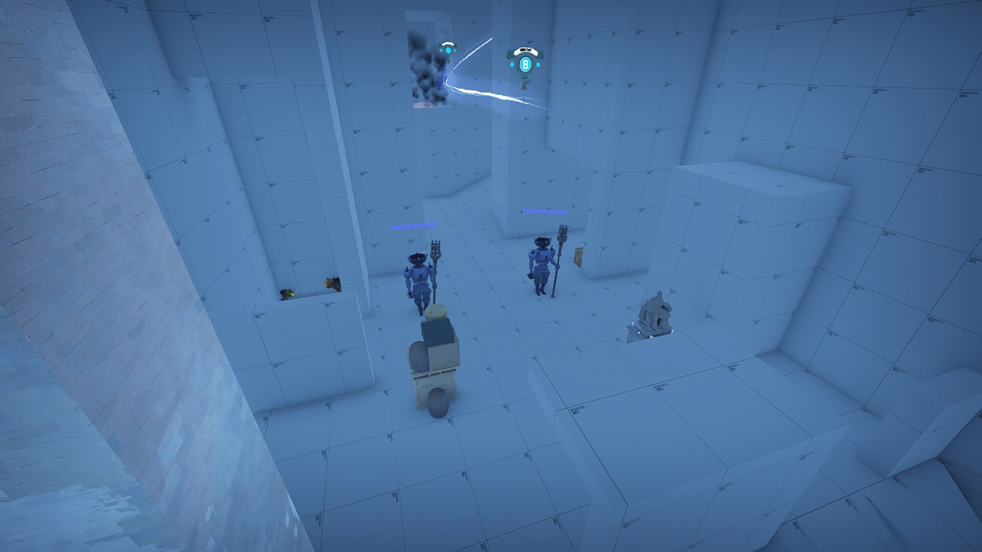 The players spawn in their respective spawn rooms.